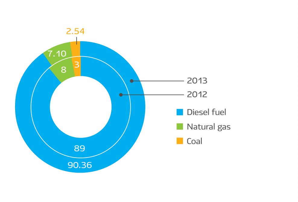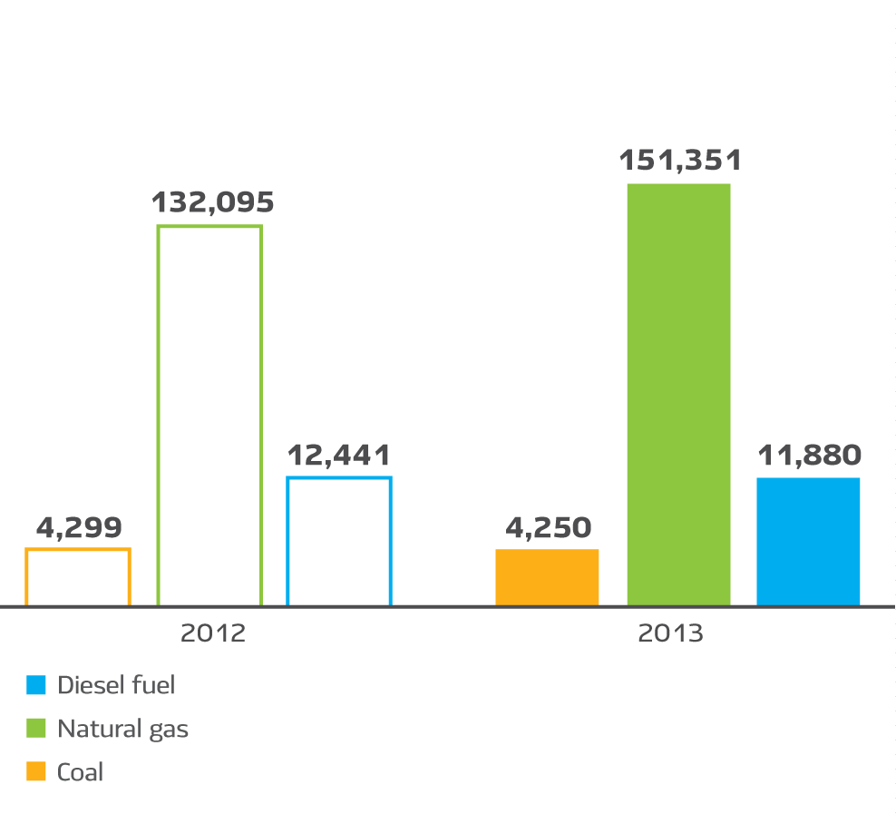 The amounts and structure of direct consumption of energy derived from non-renewable energy sources underwent changes in the reporting year in comparison to 2012. The amounts of direct energy consumption in 2013 increased by 12.5% (18,095 TJ) in relation to the level recorded in 2012. Meanwhile, gas consumption increased by 14.6% (attributed to low levels of water in reservoirs of hydropower plants and an increase in the share of electric power generated by combined heat and power plants); the consumption of diesel fuel and coal went down by 4% and 1.1%, respectively.