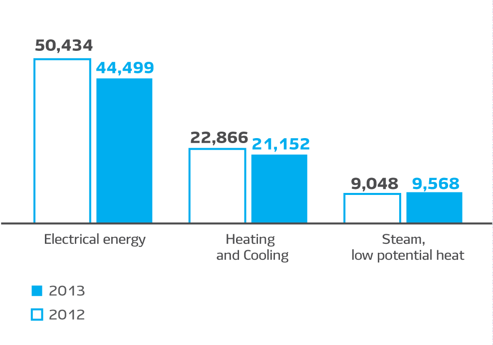 In 2013, the consumption of indirect energy decreased by 8.7% (7,129 TJ) as compared to 2012. Meanwhile, the consumption of electrical energy went down by 11.8% and the consumption of energy for heating and cooling—by 7.5%. However, the consumption of steam energy rose by 5.7%. The structure of the indirect energy consumption underwent some insignificant changes in the reporting year as compared to 2012. It should be noted that significant levels of energy are generated by the Group’s own enterprises.