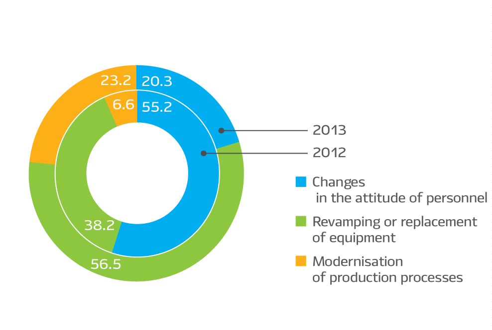 In 2013, the Group’s Russian enterprises saved a total of 2,058 TJ (0.86% of the total energy consumption, or 2.7% of the indirect energy consumption) as a result of implementing a series of measures. In 2012, more than half (55.2%) of the energy conserved resulted from efforts aimed changing the attitudes of personnel, and in 2013 a major part of energy savings was achieved due to equipment revamping or replacement (56.5%). The impact of production modernisation also increased: while in 2012 the share of energy conserved due to modernisation was only 6.6%, it tripled in the reporting year, reaching 23%.