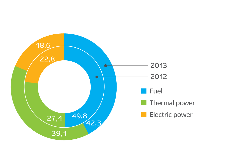 The greatest reduction in energy consumption was in thermal energy, where savings went from 27.4% in 2012 to 39.1% in 2013. The proportion of energy saved as a result of fuel conservation went down from 49.8% to 42.3%. The amount of energy saved as a result of measures at aimed to reduce energy consumption, also decreased insignificantly —from 22.8% to 18.6%.